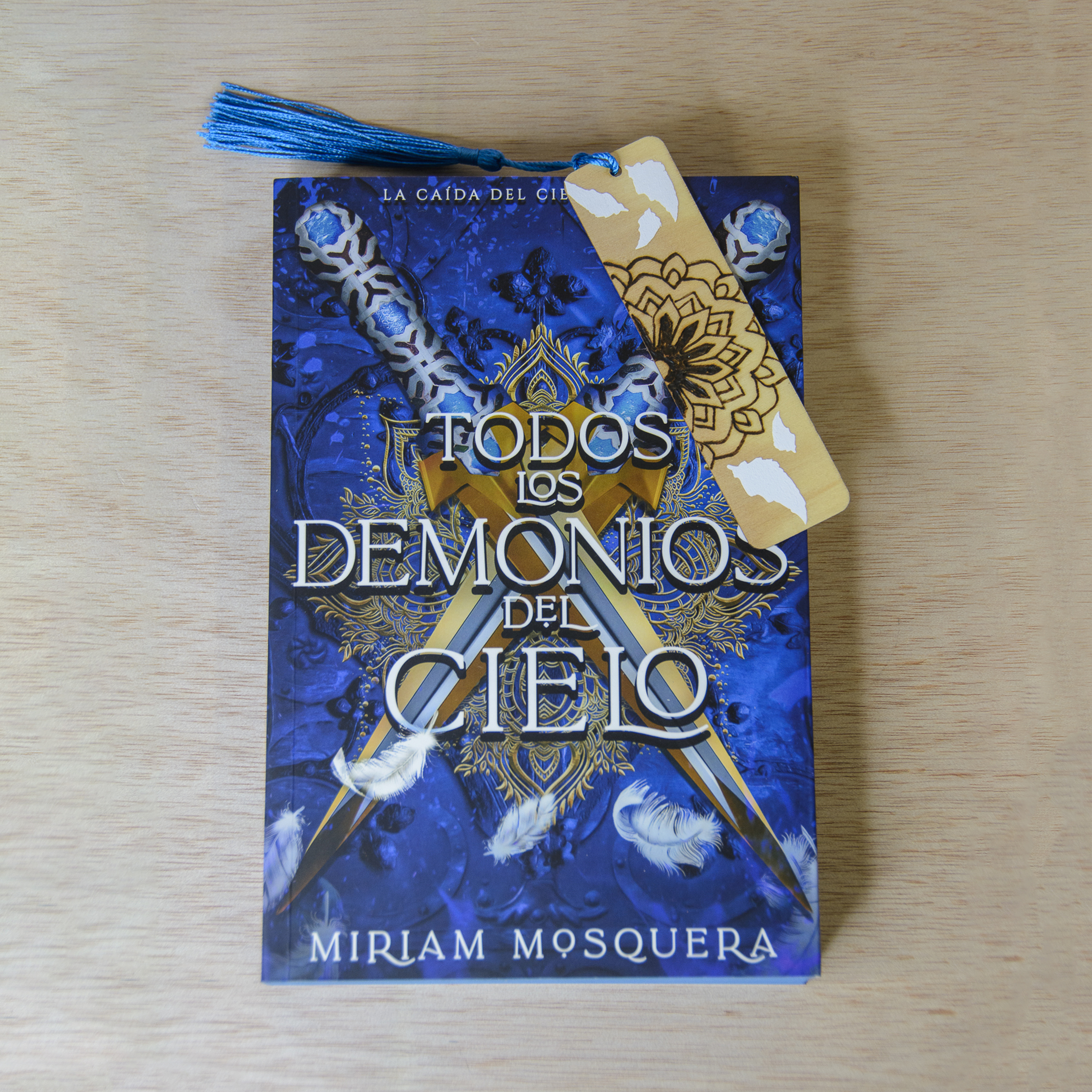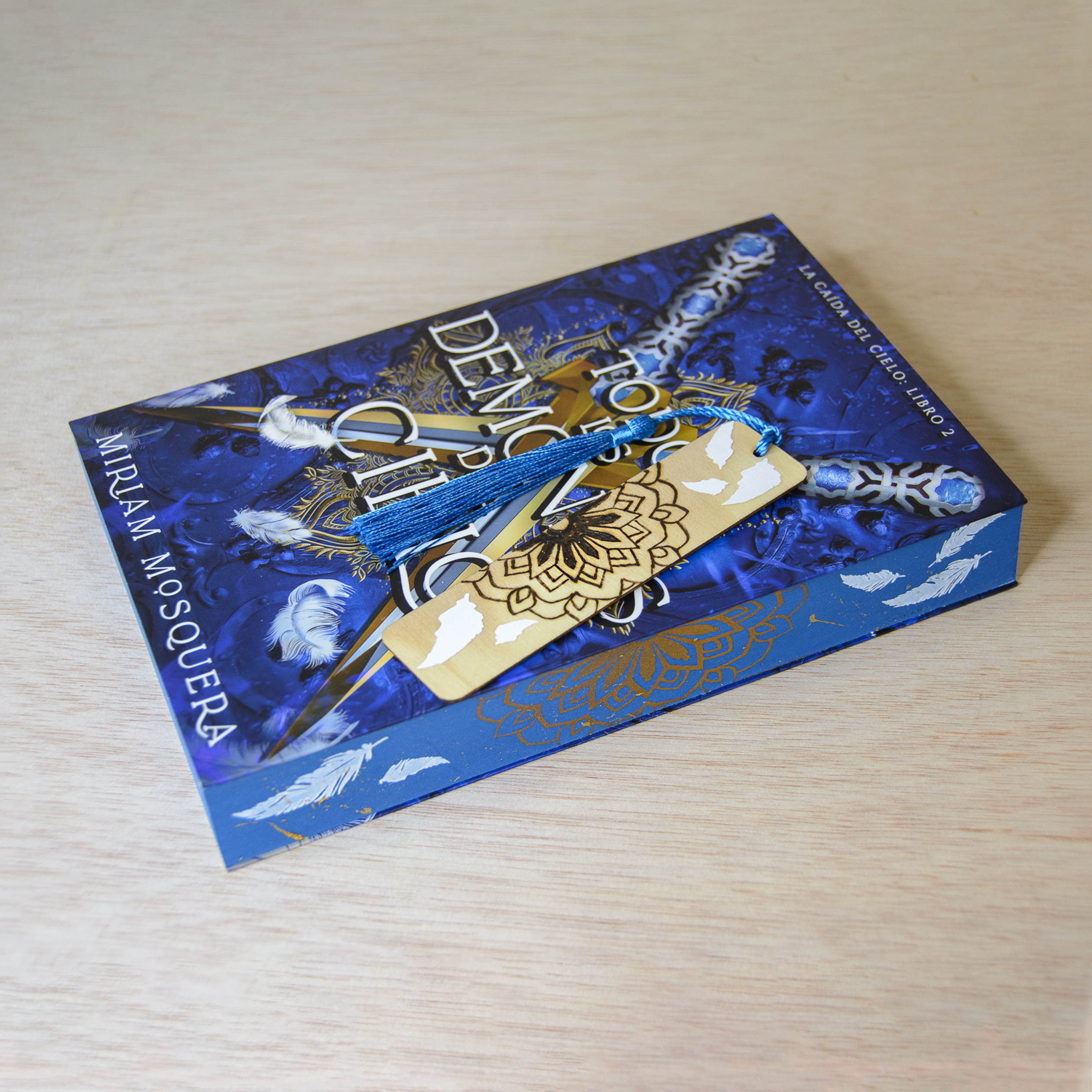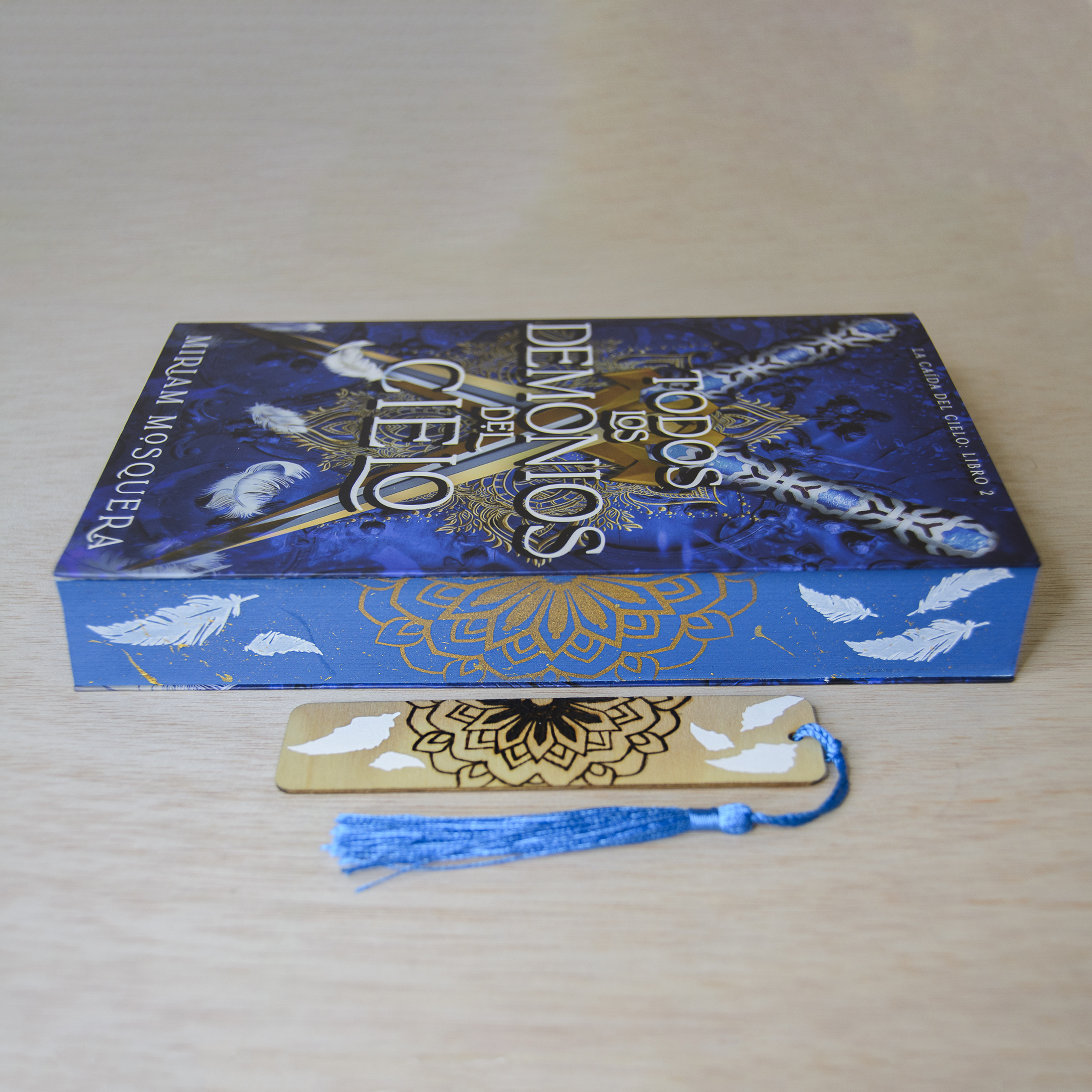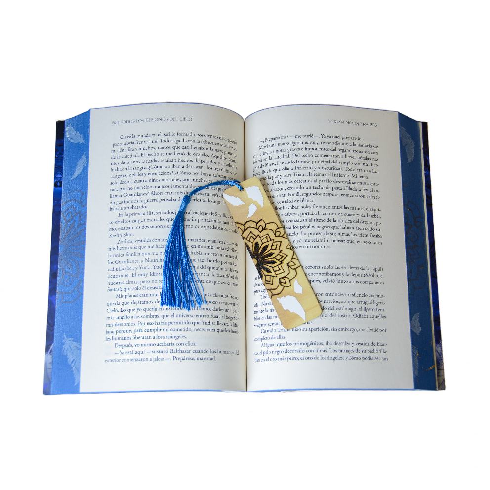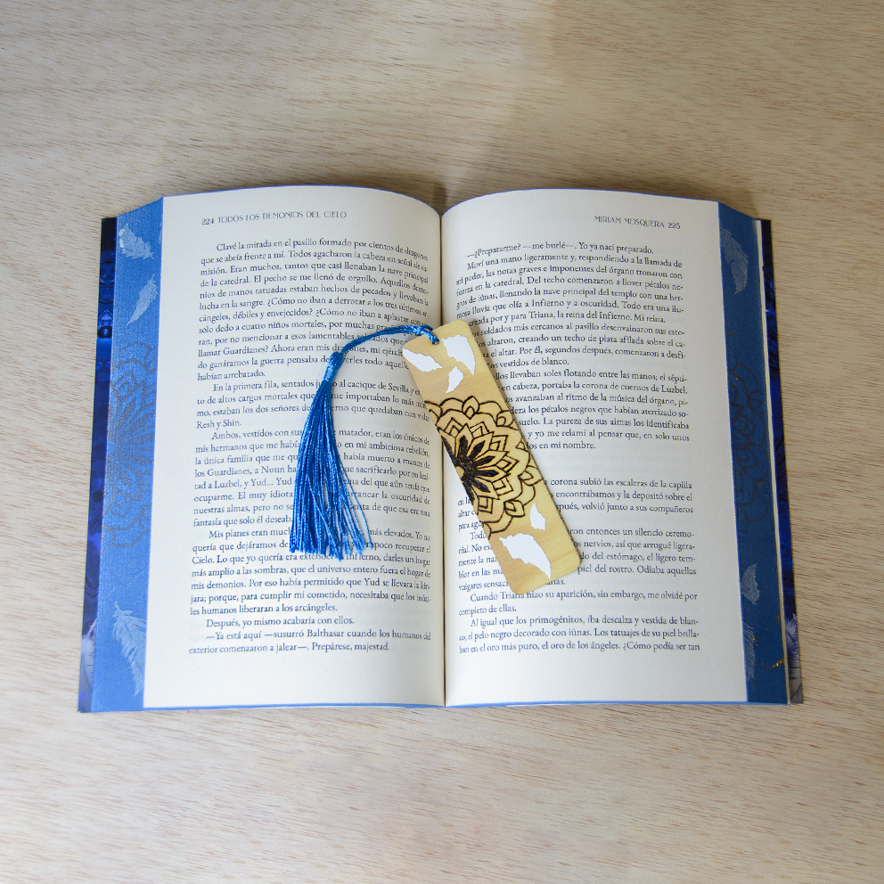 Precioso marcapáginas de madera, creado en colaboración con el diseño de los cantos pintados de ARTE CON LIBROS para el libro de MIRIAM MOSQUERA «Todos los demonios del cielo» (segunda parte de la bilogía), mezclando diferentes técnicas que nos caracterizan.