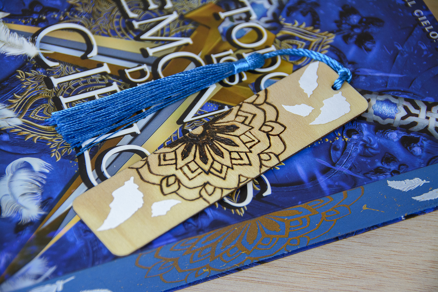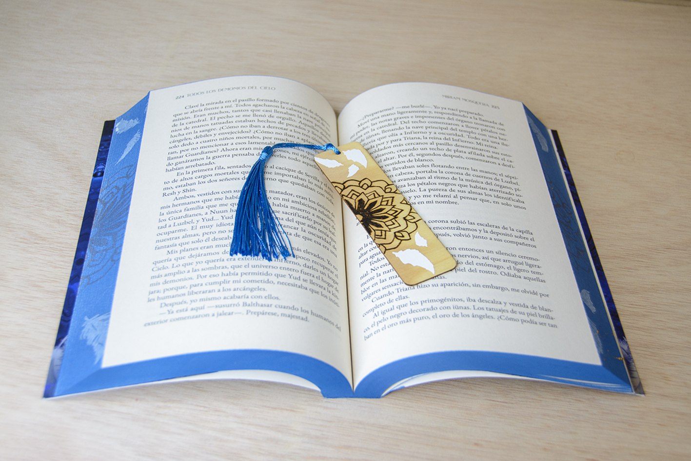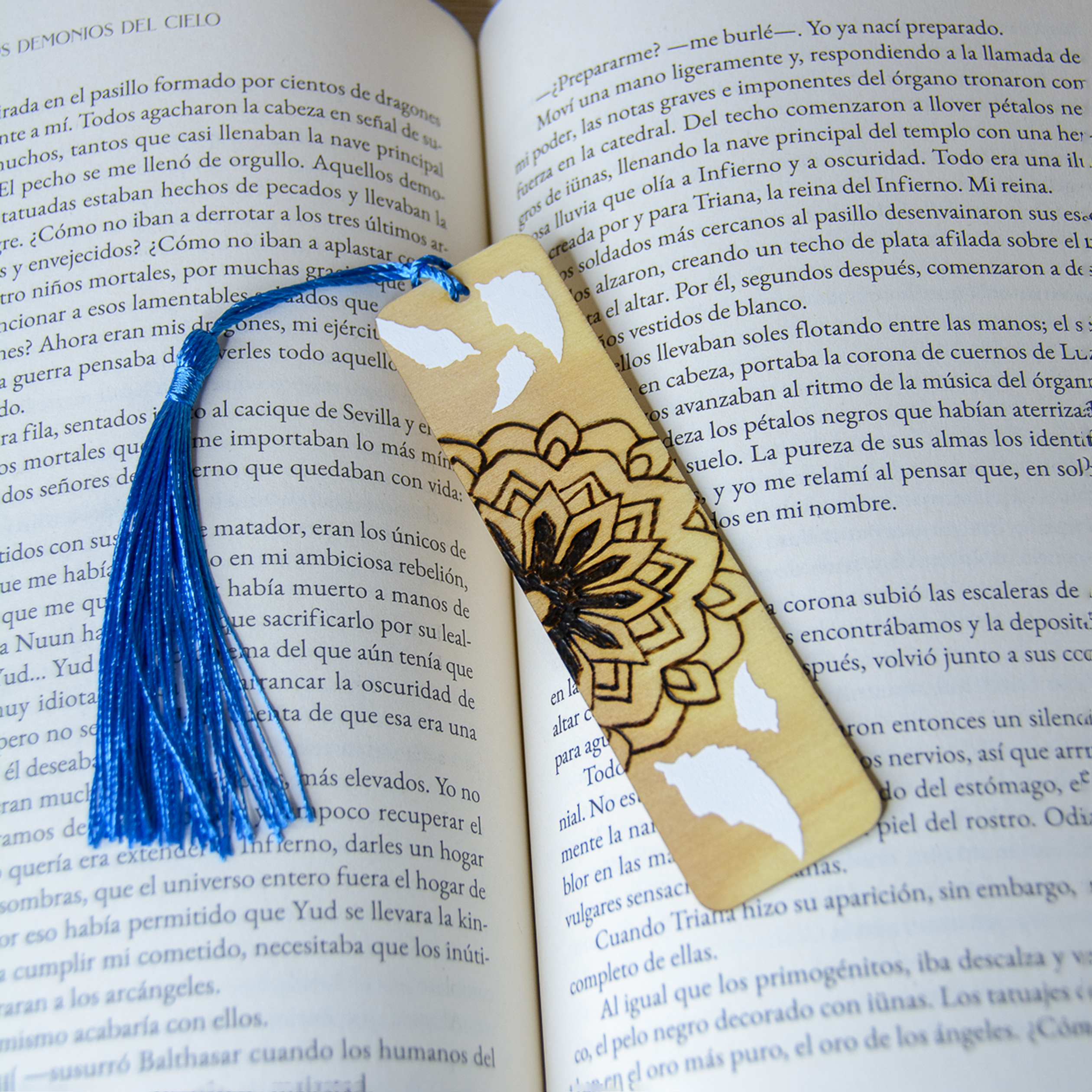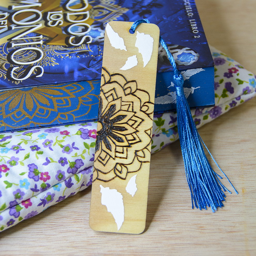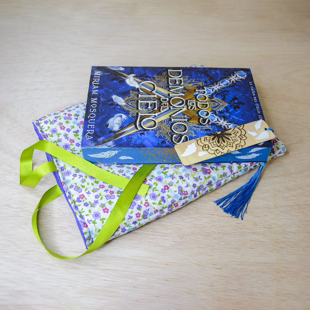 Precioso marcapáginas de madera, creado en colaboración con el diseño de los cantos pintados de ARTE CON LIBROS para el libro de MIRIAM MOSQUERA «Todos los demonios del cielo» (segunda parte de la bilogía), mezclando diferentes técnicas que nos caracterizan.