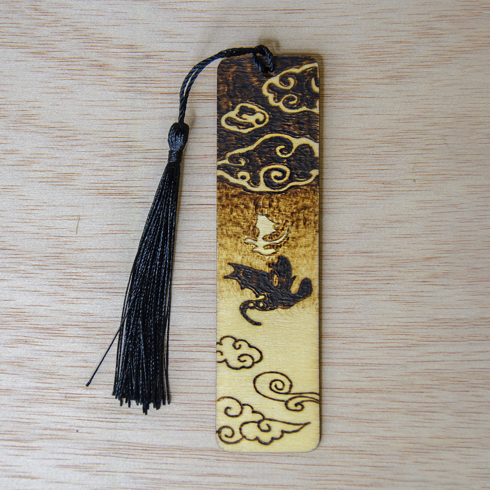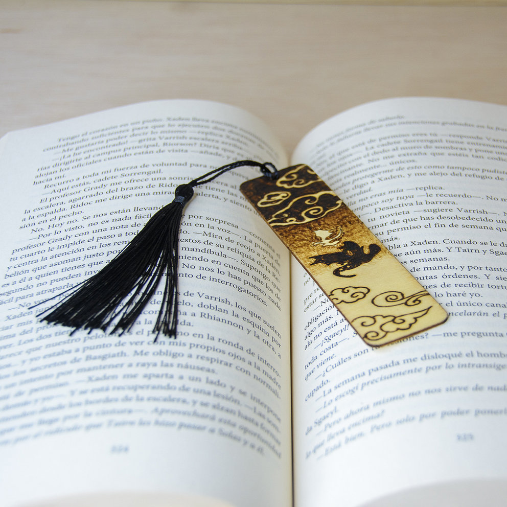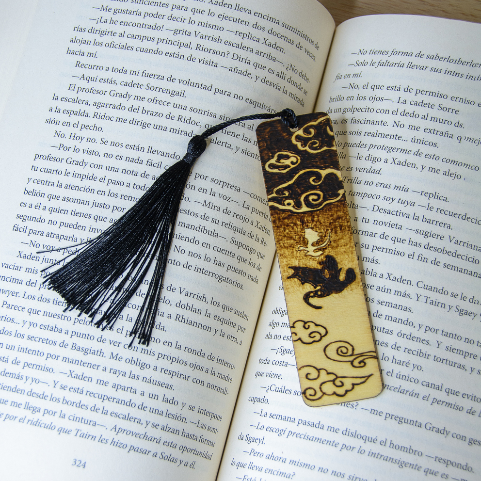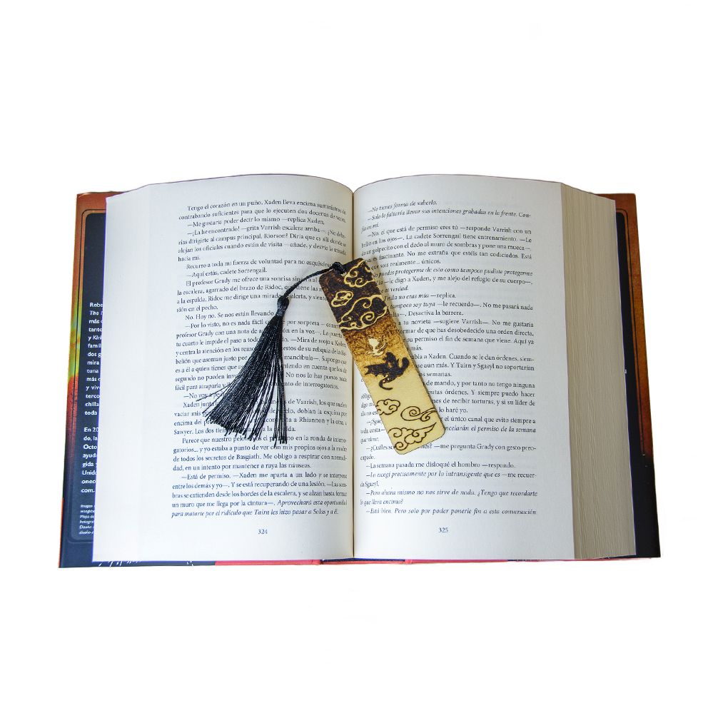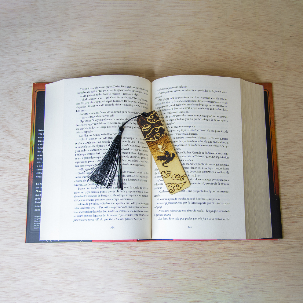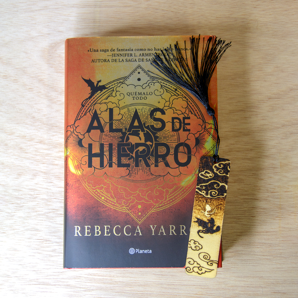 Precioso marcapáginas de madera, creado en colaboración con el diseño de los cantos pintados de ARTE CON LIBROS para los libros de REBECCA YARROS de la saga Empíero «Alas de sangre» o la continuación «Alas de hierro», únicamente con la técnica del pirograbado.