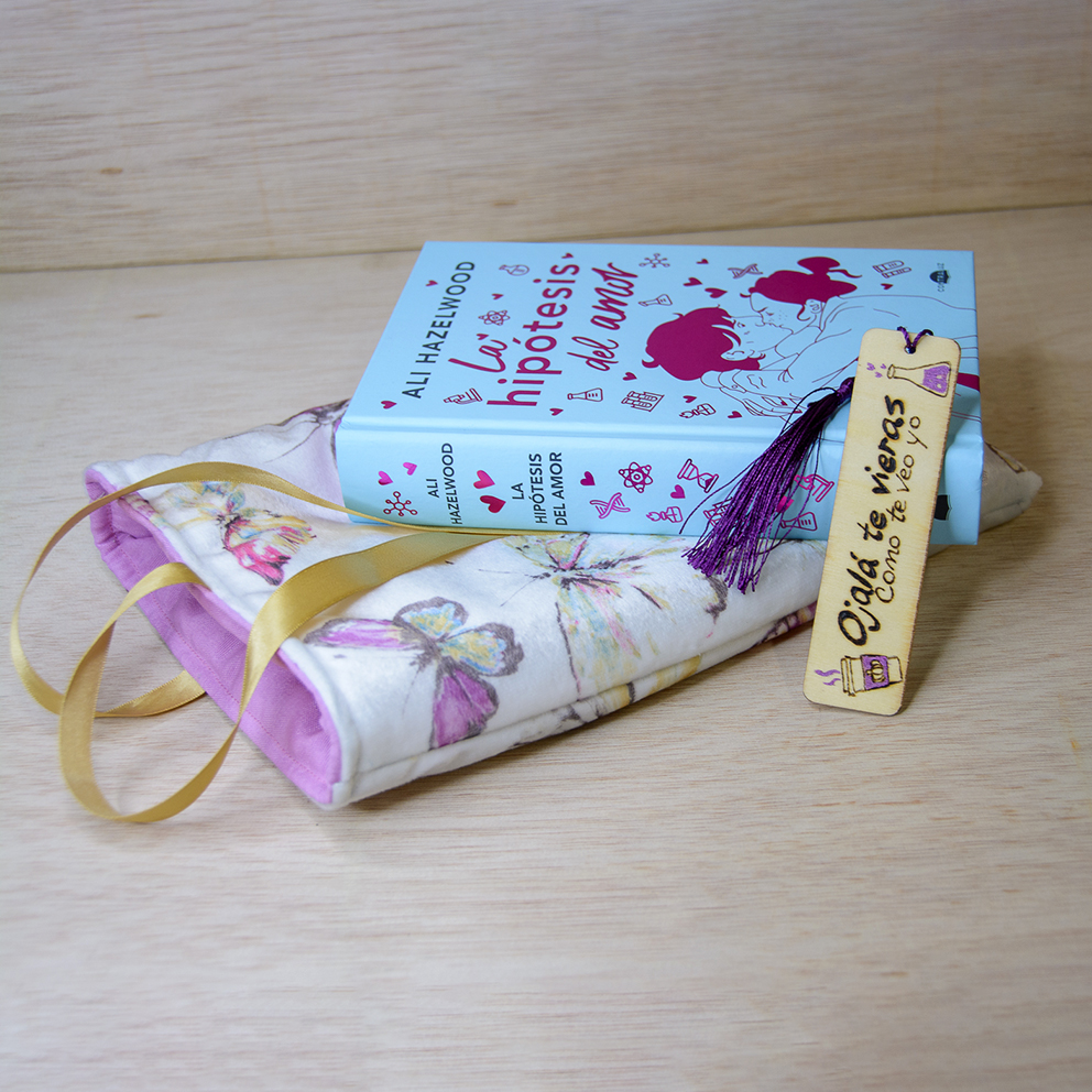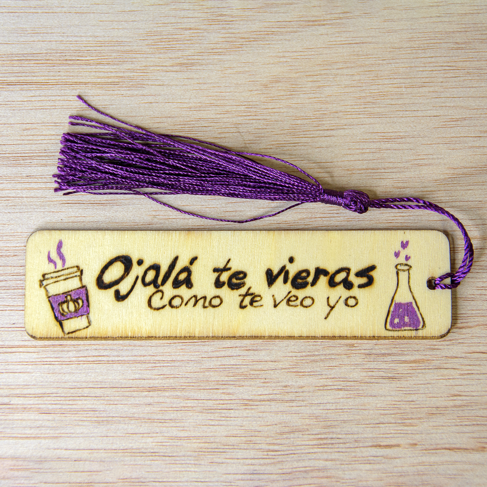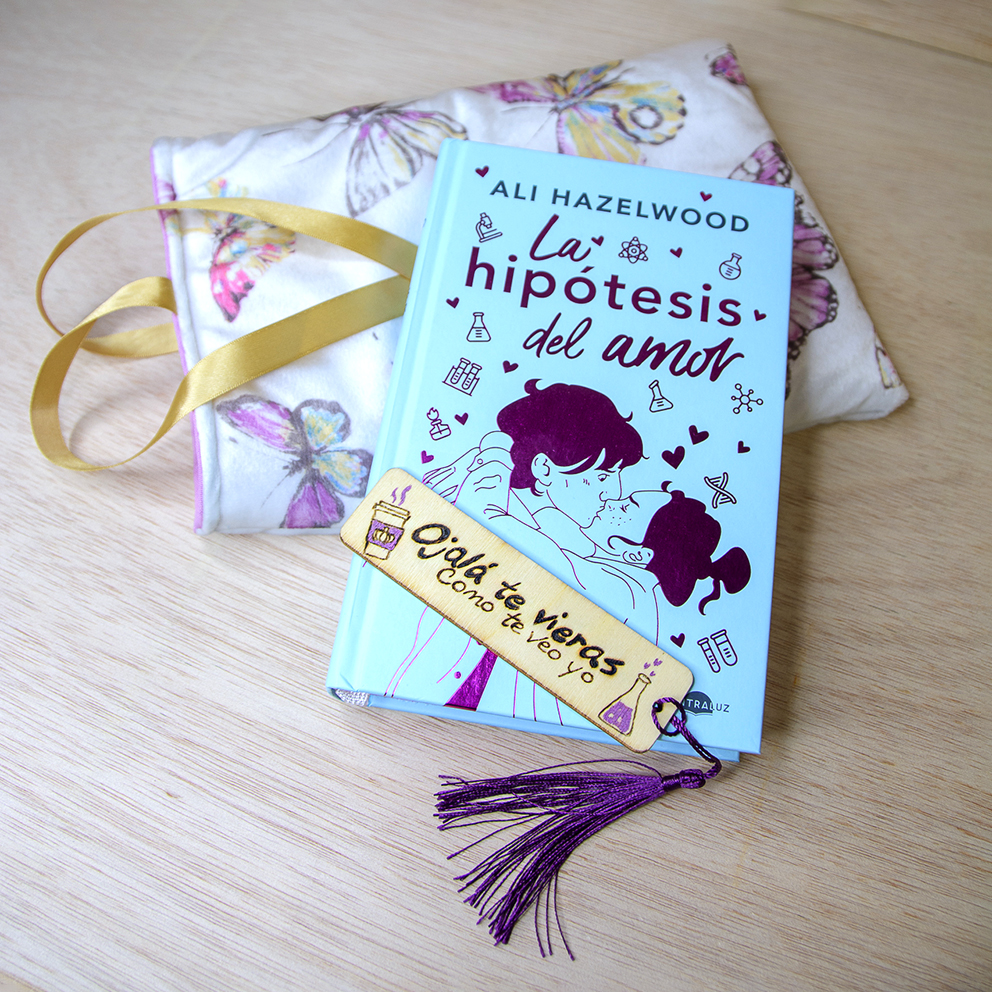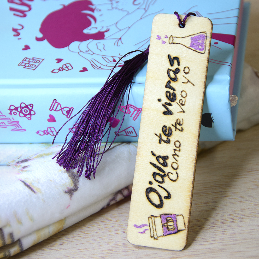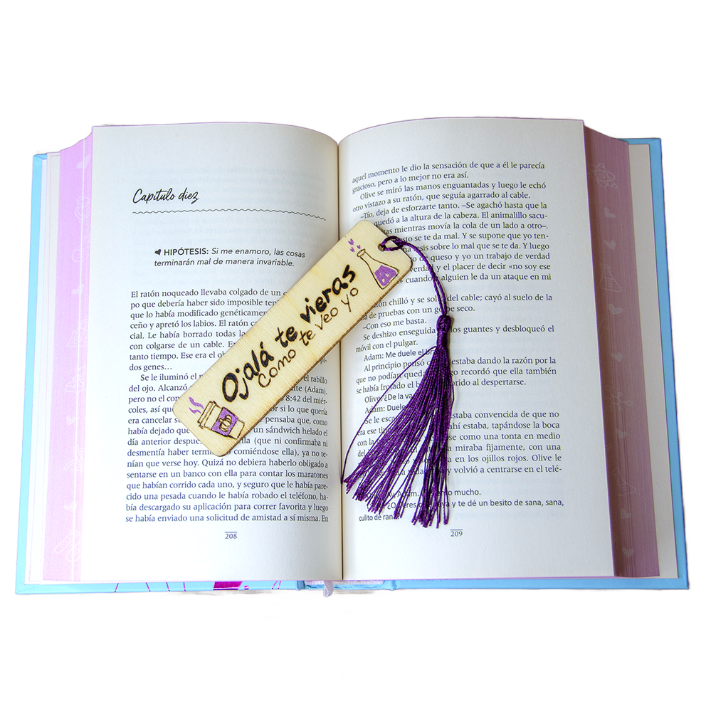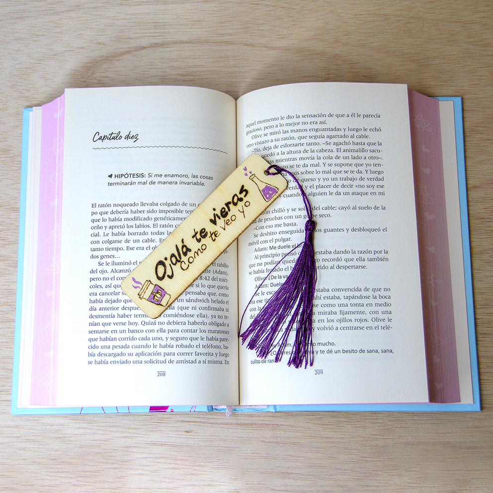 Precioso marcapáginas de madera, creado para los libros de ALI HAZELWOOD «La hipótesis del amor», con la técnica del pirograbado y pintura acrílica metalizada.